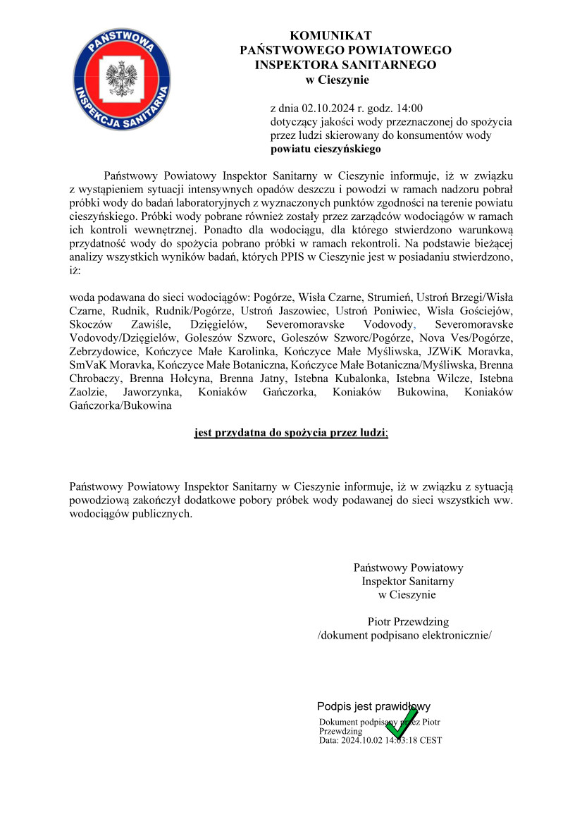 KOMUNIKAT PAŃSTWOWEGO POWIATOWEGO INSPEKTORA SANITARNEGO w Cieszynie