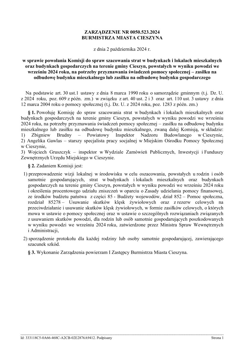 Powołanie Komisji do spraw szacowania strat w budynkach i lokalach mieszkalnych oraz budynkach gospodarczych na terenie gminy Cieszyn