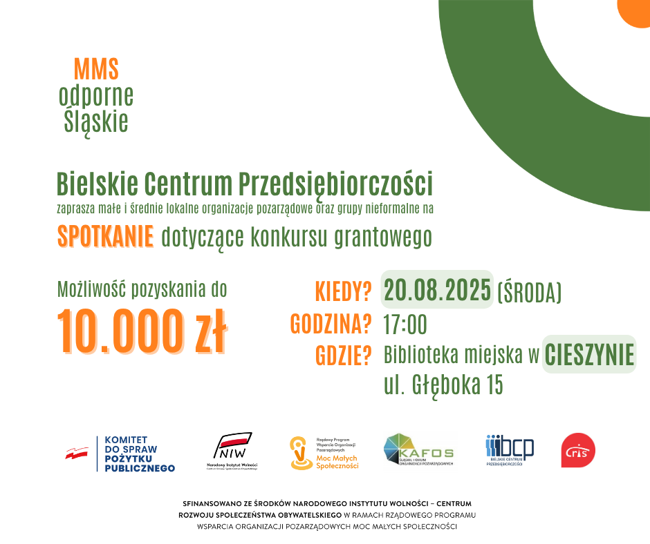 Stowarzyszenie Bielskie Centrum Przedsiębiorczości w partnerstwie z Centrum Rozwoju Inicjatyw Społecznych CRIS oraz Śląskim Forum Organizacji Pozarządowych „KAFOS” rozpoczęło realizację projektu grantowego „MMS – odporne Śląskie”.