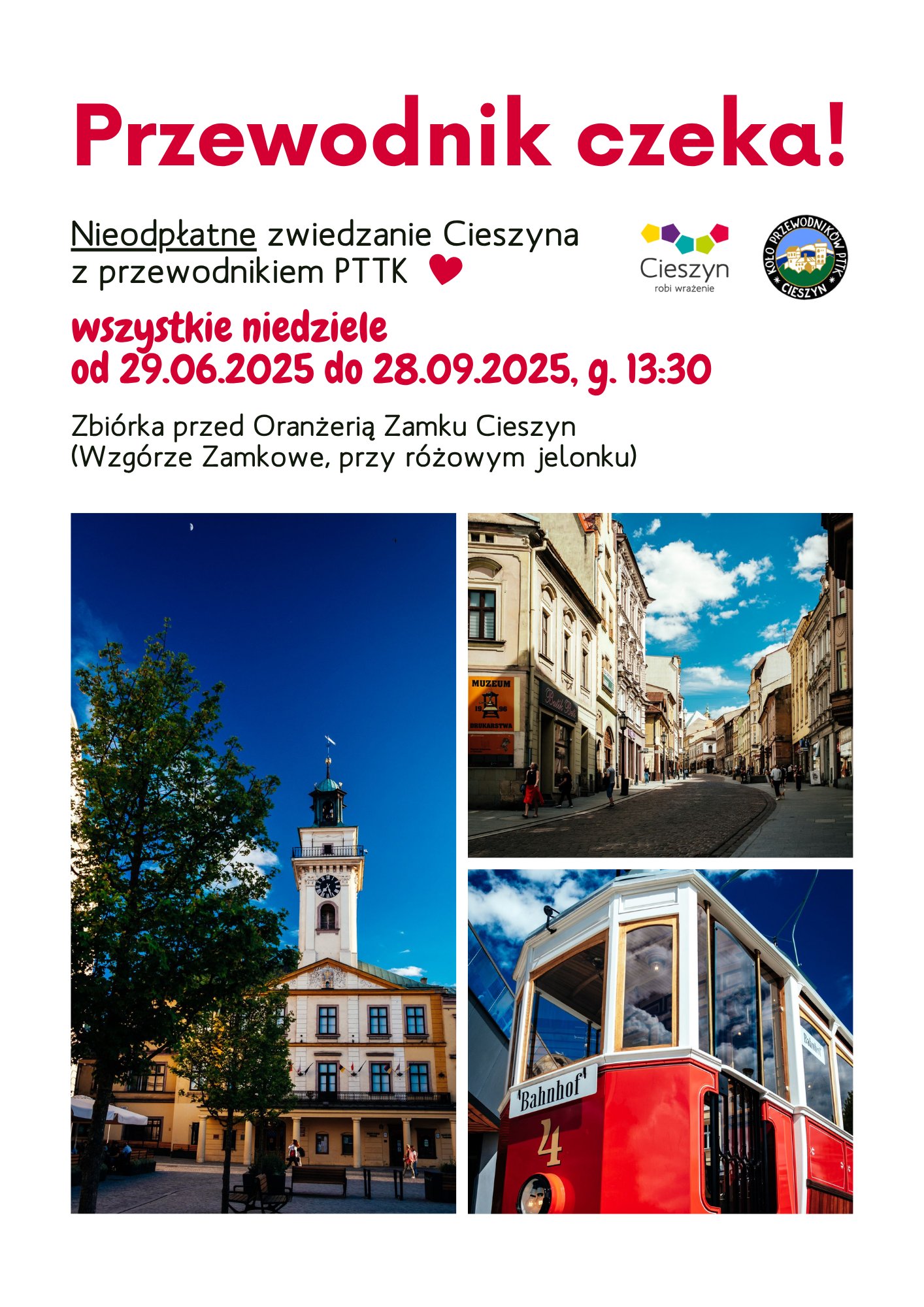 13:30 „Przewodnik czeka” bezpłatne zwiedzanie miasta z przewodnikiem PTTK (zbiórka pod Oranżerią Zamku Cieszyn - różowy jelonek)
