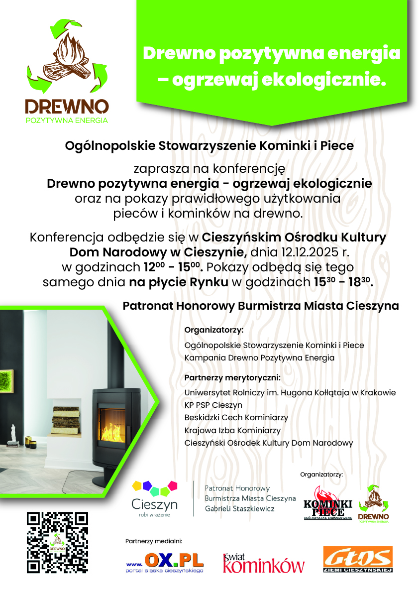 2025-12-09Ogólnopolskie Stowarzyszenie Kominki i Piece, pod Honorowym Patronatem Pani Burmistrz Miasta Cieszyn, serdecznie zaprasza na inspirujące spotkanie poświęcone zasadom prawidłowego i ekologicznego stosowania drewna kawałkowego w ogrzewnictwie indywidualnym w nowoczesnych miejscowych ogrzewaczach pomieszczeń - piecach i kominkach. „Drewno pozytywna energia - ogrzewaj ekologicznie”.