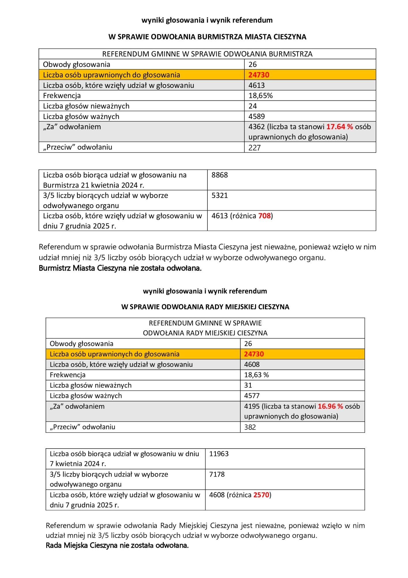 Wyniki - referendum w sprawie odwołania Burmistrza Miasta Cieszyna oraz Rady Miejskiej Cieszyna przed upływem kadencji
