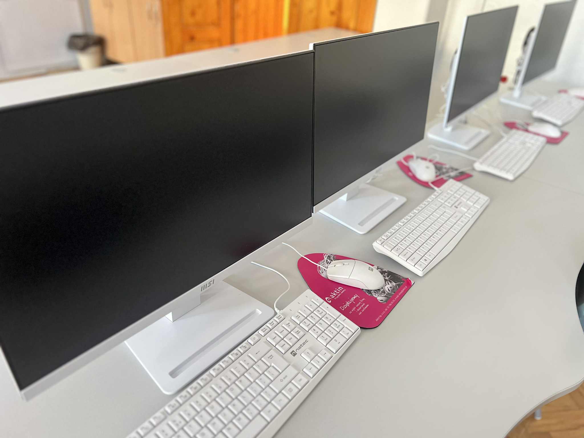 Rząd stanowisk komputerowych w jasnej sali: monitory, klawiatury i myszy ustawione na biurkach.
