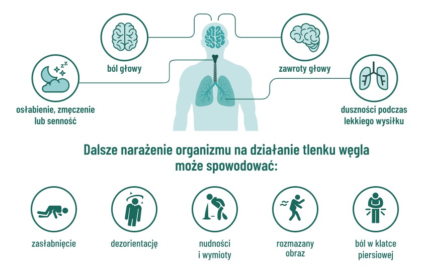 Nie wolno bagatelizować bólu i zawrotów głowy, duszności, senności, osłabienia, przyspieszonej czynności serca – mogą one być sygnałem, że ulegamy zatruciu tlenkiem węgla. W takiej sytuacji należy natychmiast przewietrzyć pomieszczenie, w którym się znajdujemy i zasięgnąć porady lekarskiej.