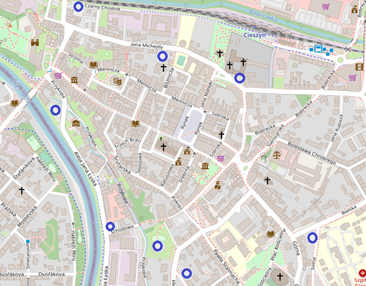 Darmowe parkingi w Śródmieściu (niebieskie kółka na mapie)