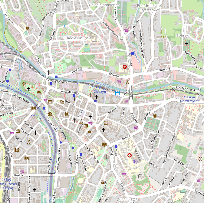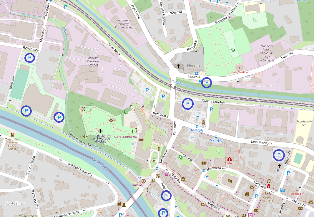 Darmowe parkingi w mieście (niebieski kropki na mapie)