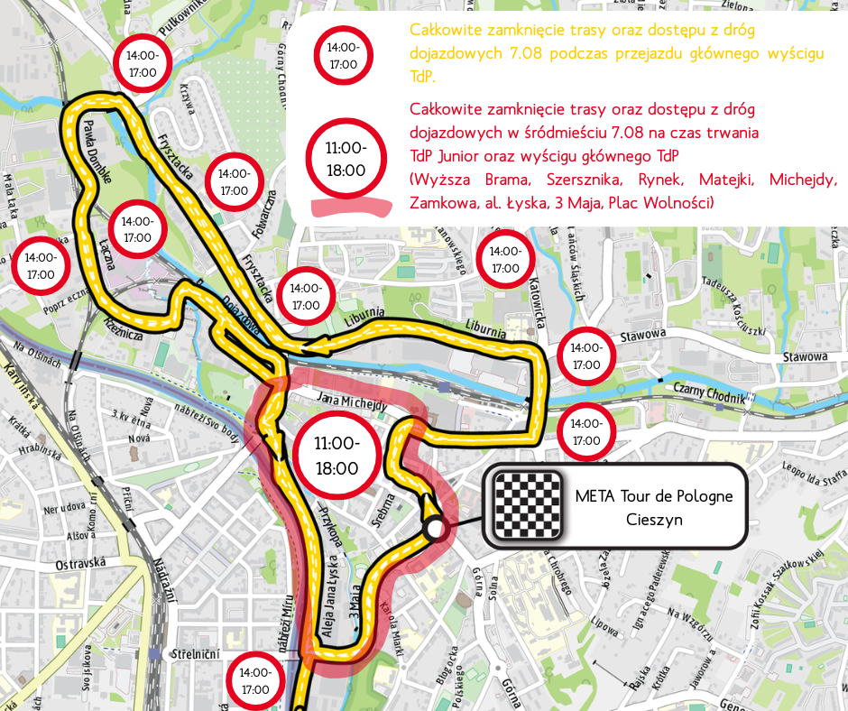 Jak wspomniano, aby odpowiednio zabezpieczyć wyścig, około godz. 14:00, nastąpi całkowite zamknięcie trasy IV etapu Tour de Pologne na czas przejazdu zawodników. W Cieszynie kolarze będą mieli do przejechania 4 rundy po zabytkowym centrum, w tym pierwszą z nich prowadzącą przez teren Arcyksiążęcego Browaru Zamkowego. Kulminacyjny moment nastąpi około godz. 16:00-16:30 (w zależności od warunków na trasie całego etapu), kiedy to najlepsi kolarze świata wjadą na metę zlokalizowaną na Placu Wolności. Chwilę później odbędzie się ceremonia dekoracji zwycięzców na cieszyńskim Rynku.