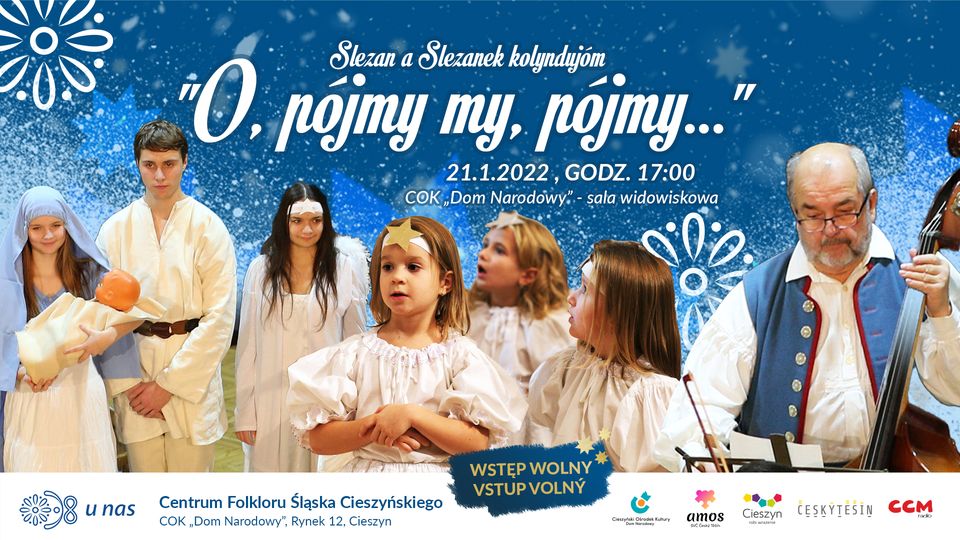 V pátek 21.01.2022 v 17:00 hodin se uskuteční vystoupení českotěšínských folklórních souborů Slezan a Slezanek v COK Dom Narodowy. Společný program pod názvem "Pójmy, my pójmy" představí koledníky v době vánoční. Akce se pořádá jako společné setkání příznivců Folklórních center Těšínského Slezska, která byla otevřena v obou městech v r. 2019 a je součástí projektu "Kaj indži inači-u nas po našymu".