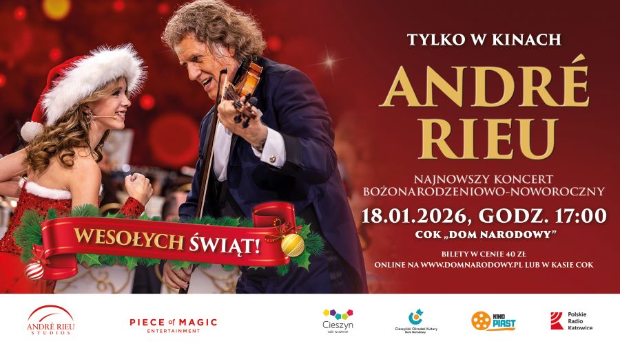 Cieszyński Ośrodek Kultury "Dom Narodowy" oraz Kino Piast zapraszają na olśniewające show Maestra André Rieu. Zapraszamy do Cieszyńskiego Ośrodka Kultury "Dom Narodowy" na retransmisję najnowszego koncertu bożonarodzeniowo-noworocznego z Maastricht pod tytułem „Wesołych Świąt!”.