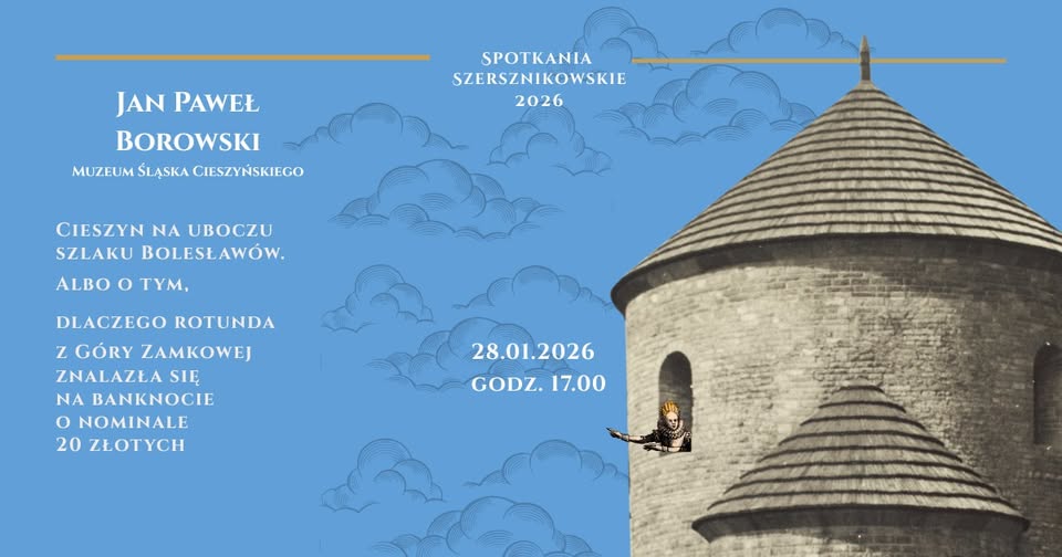 W ostatnią środę stycznia zapraszamy do siedziby Muzeum Śląska Cieszyńskiego na pierwsze tegoroczne Spotkanie Szersznikowskie: Jan Paweł Borowski wygłosi wykład „Cieszyn na uboczu szlaku Bolesławów. Albo o tym, dlaczego rotunda z Góry Zamkowej znalazła się na banknocie o nominale 20 złotych”, który przedstawił jesienią na Kongresie Mediewistów Polskich w Gnieźnie. Obiecał wówczas, że w Cieszynie również ten wykład przedstawi i teraz dotrzymuje słowa.