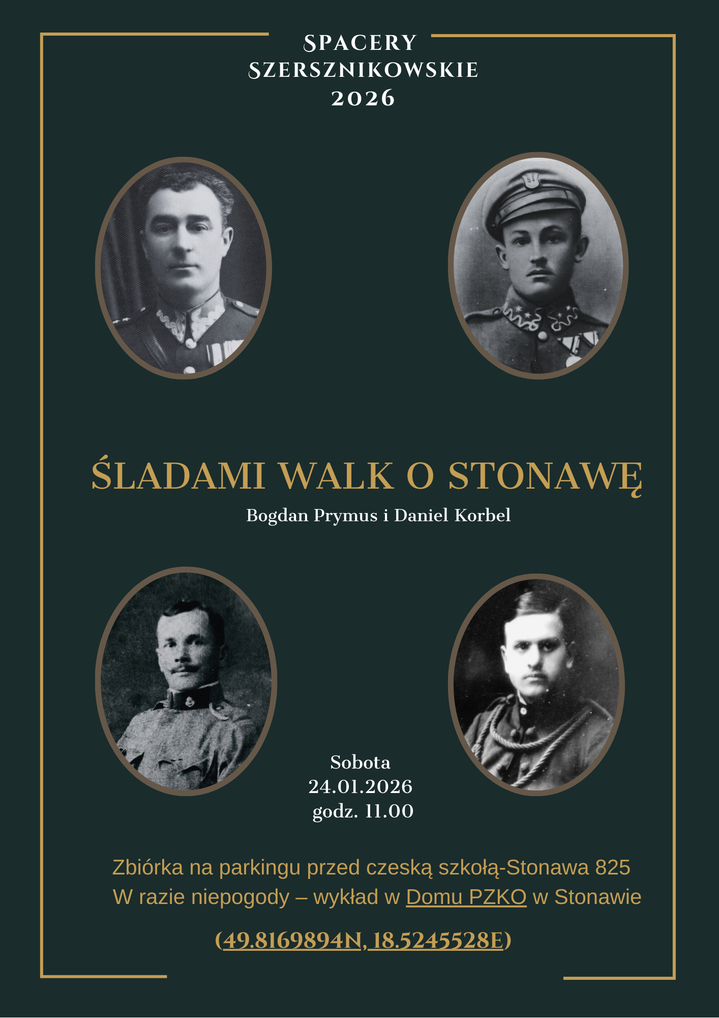 W sobotę 24.01.2026 o godz. 11.00 Muzeum Śląska Cieszyńskiego zaprasza do zaolziańskiej Stonawy na Spacer Szersznikowski „Śladami walk o Stonawę”, który poprowadzą Bogdan Prymus i Daniel Korbel. Spotykamy się przy czeskiej szkole w Stonawie-Dolanach (Stonawa 825; dojazd we własnym zakresie), spacer liczy ok. 2 km, potrwa nie mniej niż 2 godziny, a zakończy się na cmentarzu przy mogile polskich żołnierzy, poległych w wojnie polsko-czechosłowackiej 1919 r. W razie niepogody zapraszamy na wykład o tej samej porze w Domu PZKO w Stonawie.