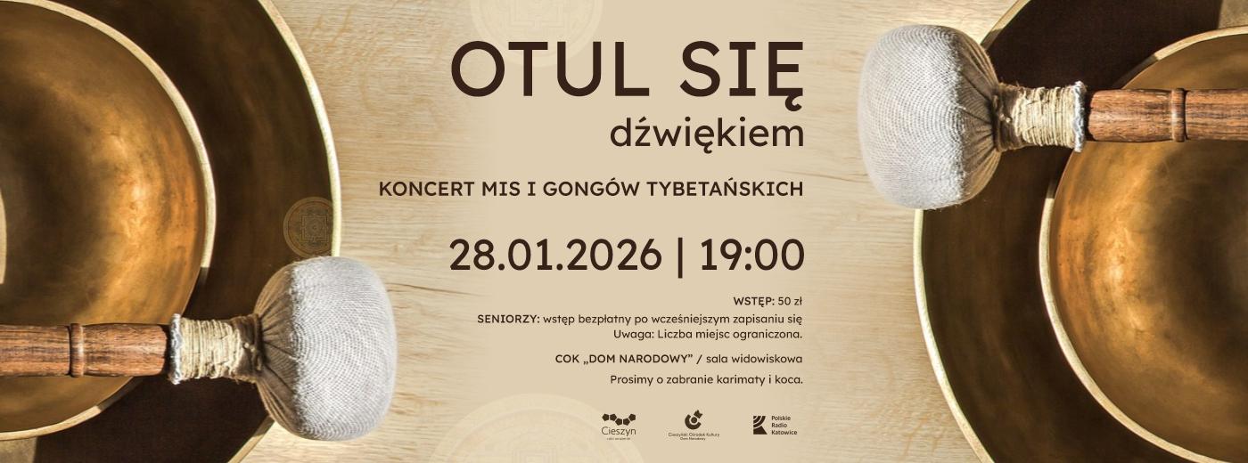 Otul się dźwiękiem. Cieszyński Ośrodek Kultury "Dom Narodowy" zaprasza na kąpiel w dźwiękach gongów i mis tybetańskich. Dźwięki podczas koncertu wpłyną na nasze ciała i emocje oraz wprowadzą nas w stan głębokiego relaksu. Wsłuchanie się w dźwięki mis daje możliwość uspokojenia emocji i myśli, powodując najczęściej ogólne rozluźnienie napięć w całym ciele. Kąpiel w gongu wyzwala: regenerację, relaksację, cierpliwość, harmonię. Uruchamia: odnowę umysłu, twórczą inspirację, intuicję, wyostrzenie koncentracji, energię, obfitość, uzdolnienia.
