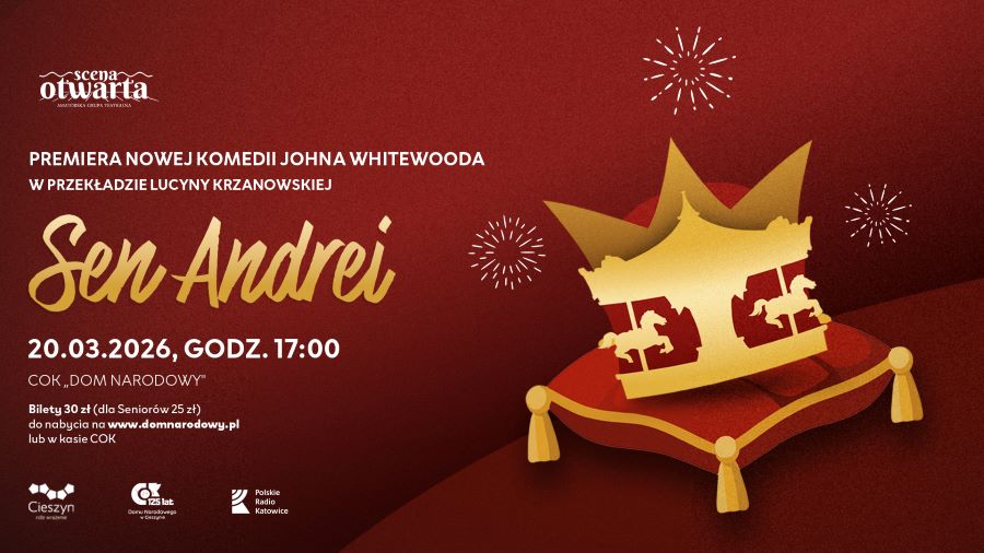 Cieszyński Ośrodek Kultury „Dom Narodowy” zaprasza na premierę spektaklu Johna Whitewooda pt. „Sen Andrei” w tłumaczeniu Lucyny Krzanowskiej. Przedstawienie w wykonaniu grupy teatralnej Scena Otwarta